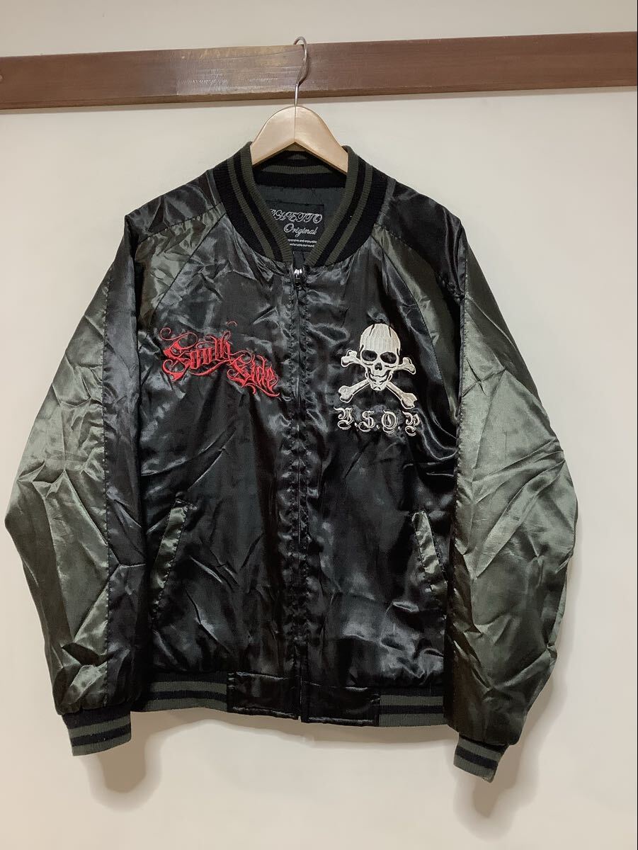 - つ1783 Ghetto Original スカジャン スーベニアジャケット L ブラック/オリーブ スカル ドクロ 中綿入り