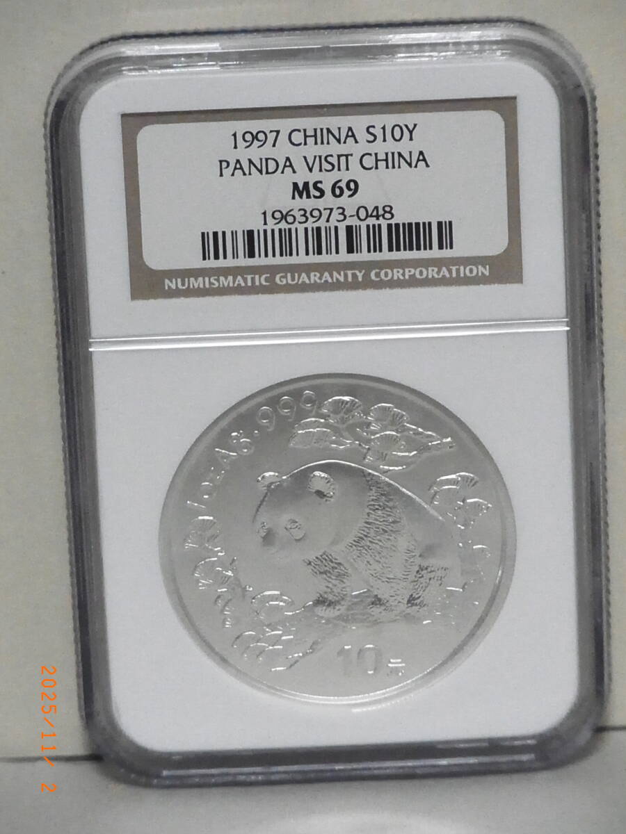 > 中国 1997年 NGC MS69 パンダ10元銀貨【裏面は中国観光年と刻む、「中国を訪問する」英文も刻む】 ★送料無料★