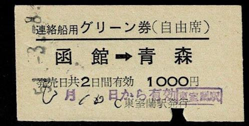 - 国鉄 青函連絡船 グリーン券 自由席 函館→青森 1000円券 東室蘭駅発行 昭和51年
