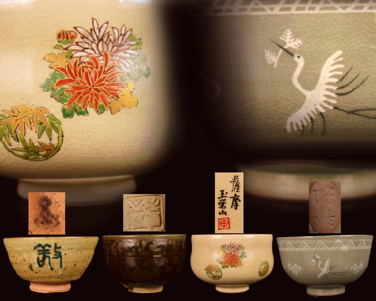 Z295 【泉美】薩摩/玉栄山 昭美 雲鶴文 茶碗 抹茶碗 4客 茶道具