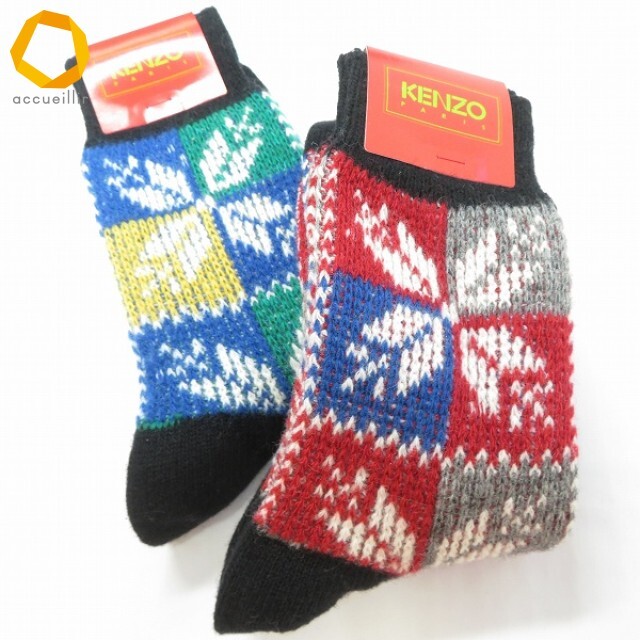 > #we ケンゾー KENZO ソックス 22~24cm 2足セット 赤系 青系 マルチ 総柄 ノルディック柄 ウール混 厚手 レディース [943003] k01
