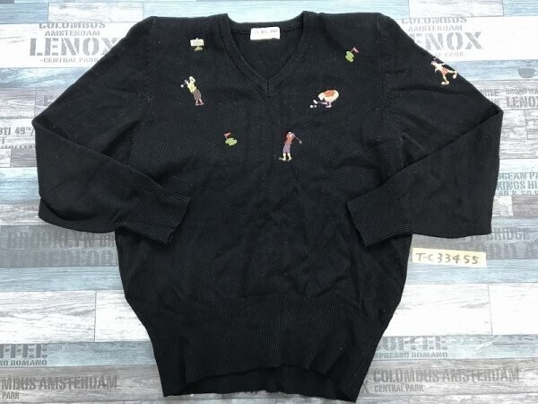 - LE BEL AGE メンズ レディース 肩パッド ゴルフ刺繍 Vネック レトロ ニットソー 黒