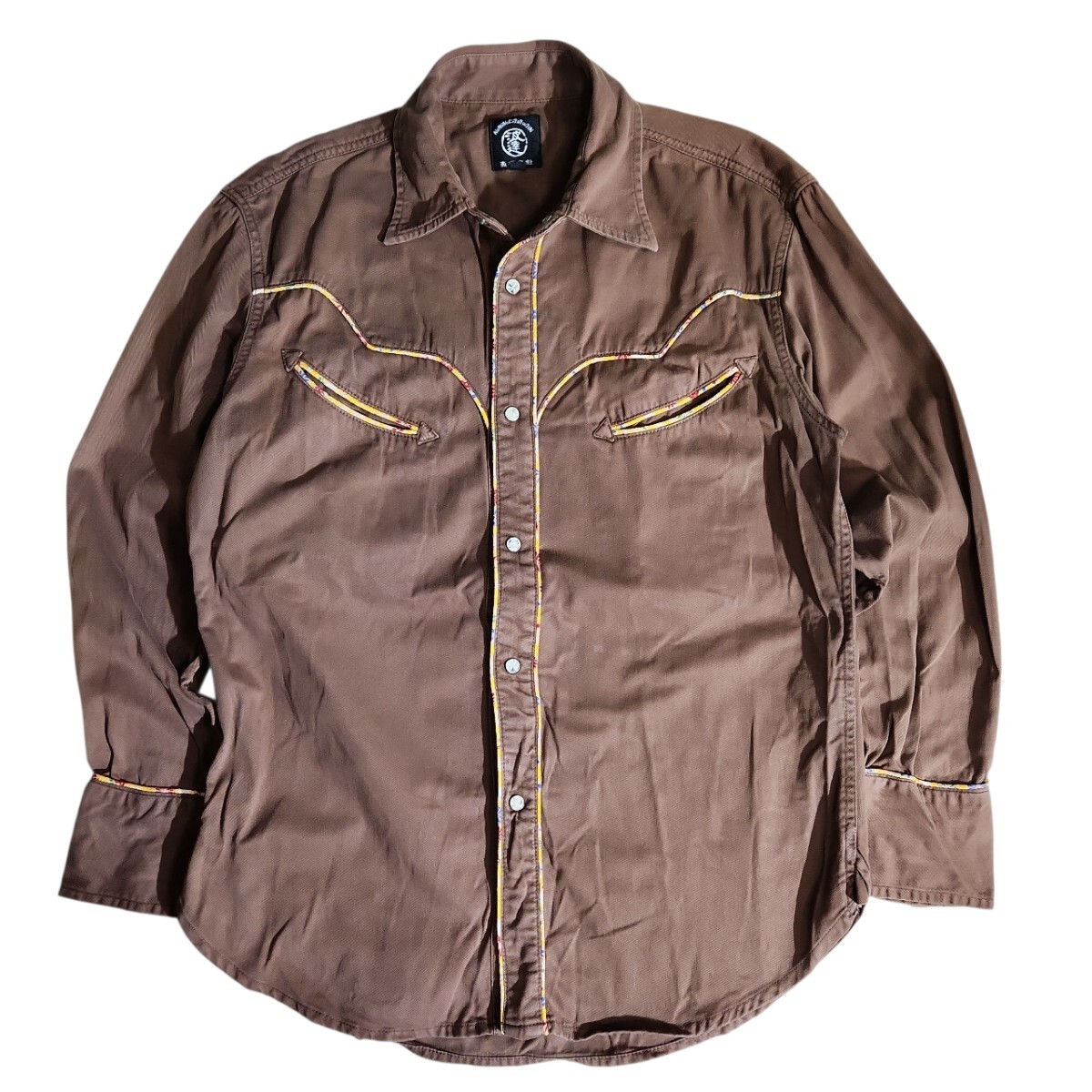 > 波達 しっかり生地 長袖ウエスタンシャツ 表記L ブラウン 和柄パイピング 日本製 総スナップボタン 84972