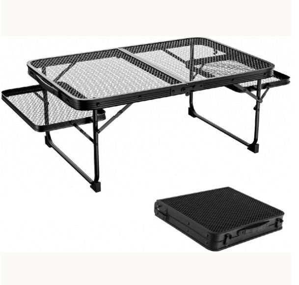 - ャンプ テーブル メッシュ アウトドアテーブル 折り畳み サイドテーブル付き 軽量 コンパクト ローテーブル 折りたたみ 耐熱 耐重荷50kg