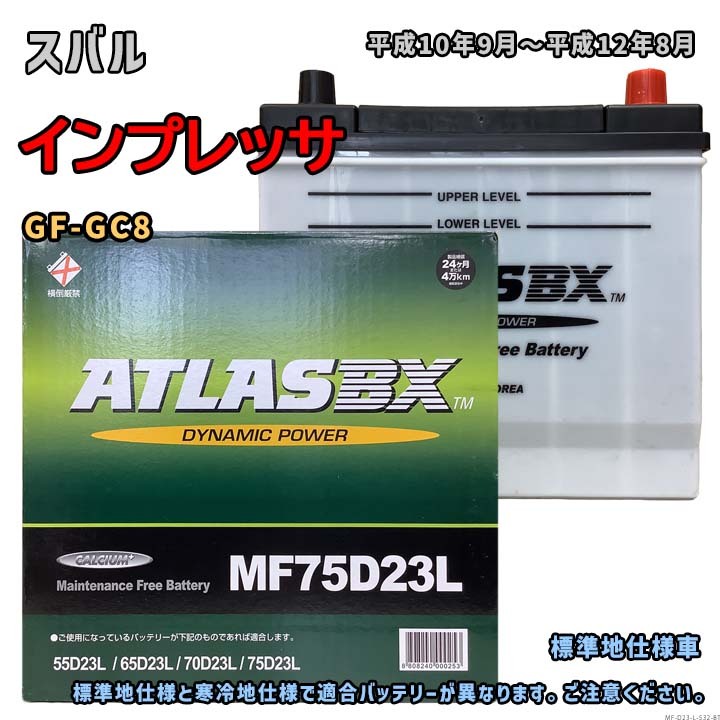- バッテリー ATLAS MF75D23L スバル インプレッサ GF-GC8 平成10年9月~平成12年8月 AT・4WD 対応 D23L 互換 532