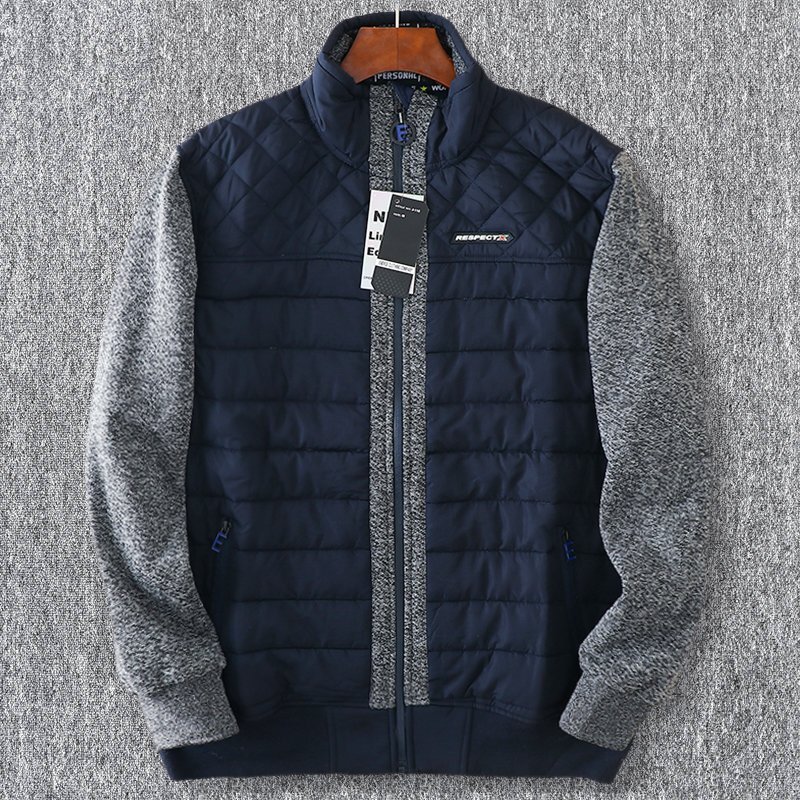 - 新品 EU製 メンズ ジャケット キルティング 中綿 切替デザイン 立ち襟 厚手 秋冬 暖かい 裏ボア ブルゾン アウター 濃紺 T5003-M