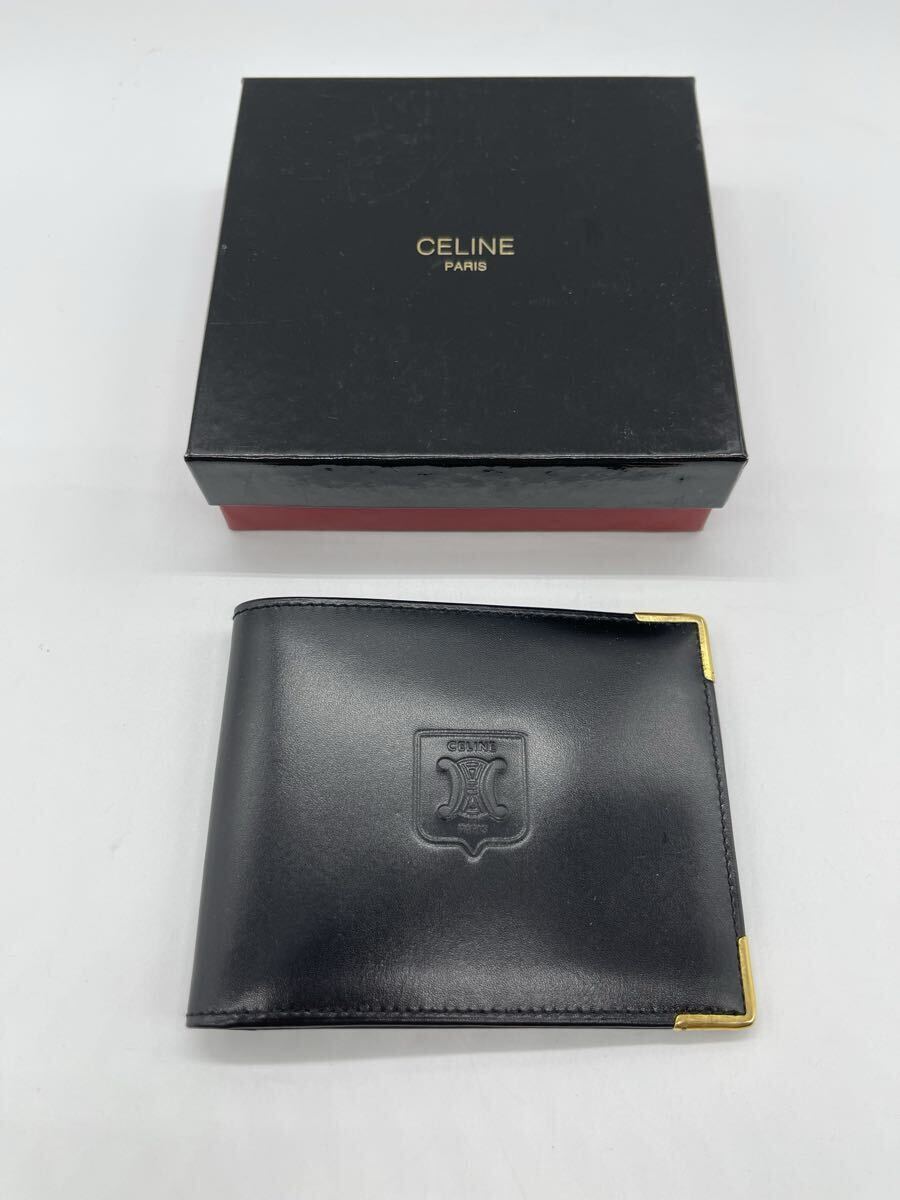 - 【1円スタート】CELINE セリーヌ 二つ折り財布 トリオンフロゴ ブラック レザー ゴールド金具 美品 箱付き