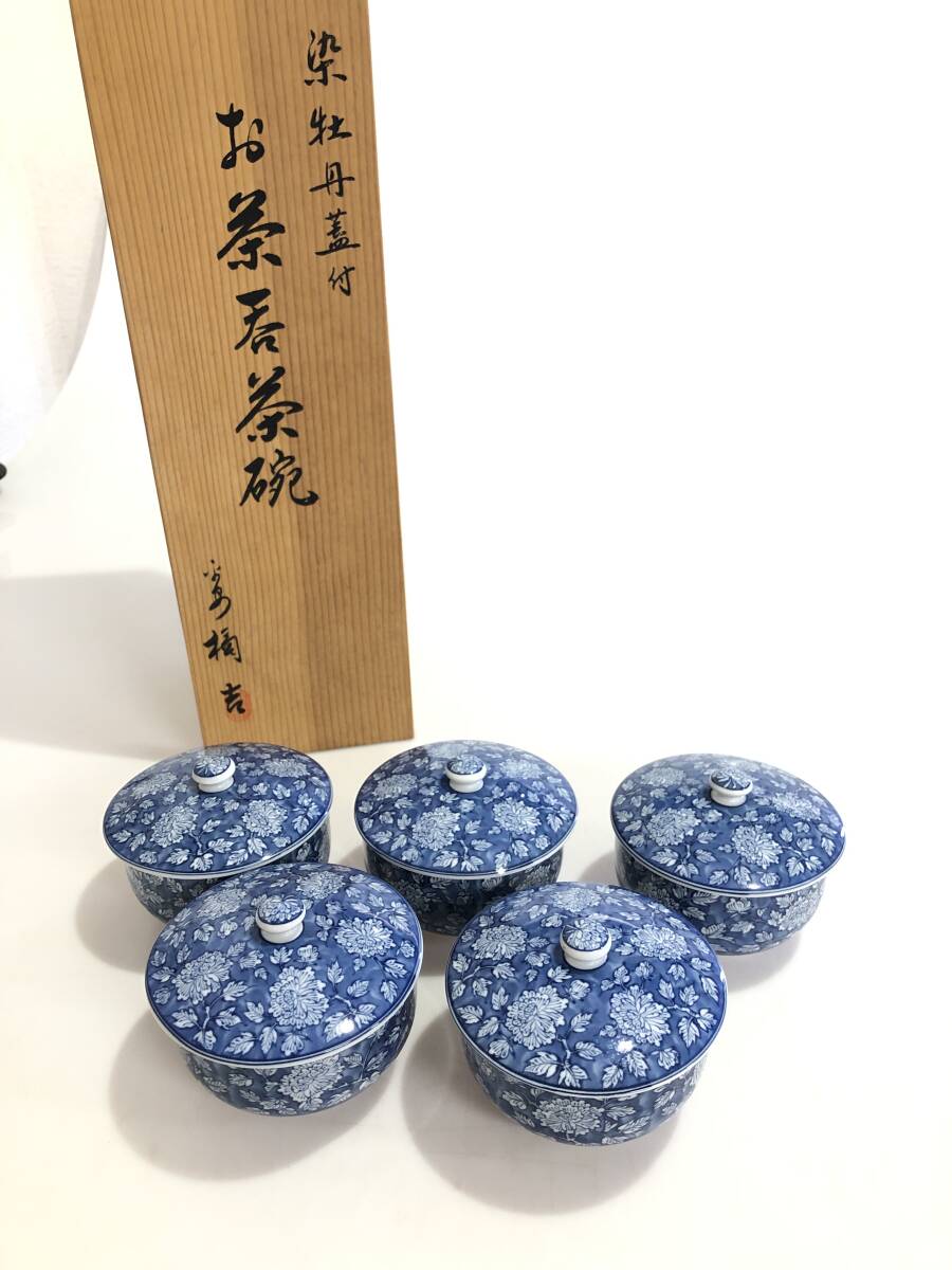 - B5273 たち吉 平安 橘吉 お茶呑茶碗 染牡丹 蓋付 湯呑 湯飲み 5客 和食器 和風
