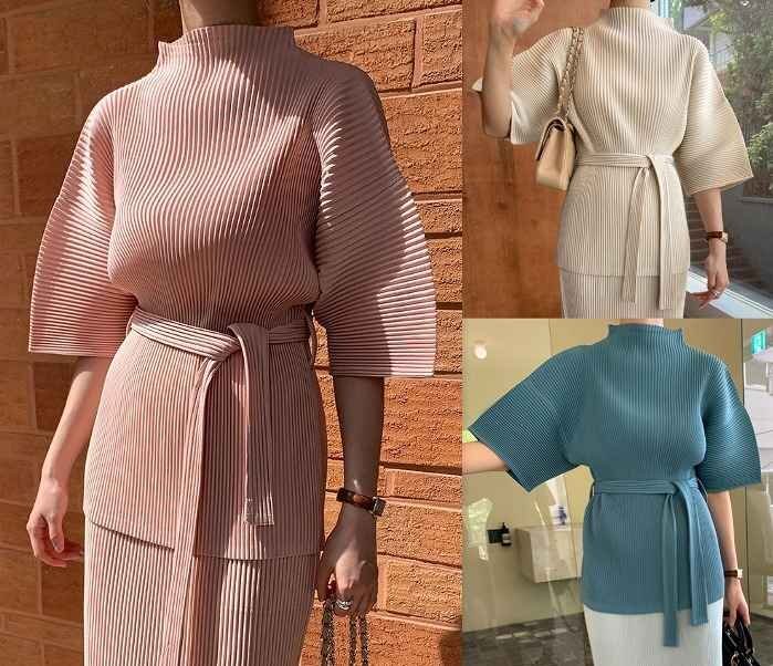 - 全3色 半袖トップス シャーリング 切り替え スリム 着痩せ シンプル フリー オフホワイト