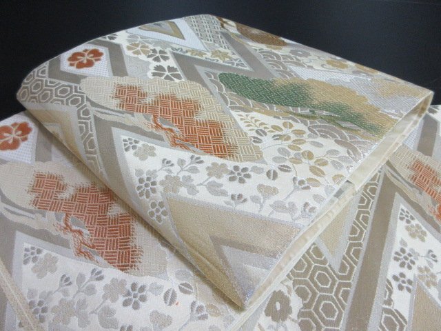- 1円 良品 袋帯 正絹 和装 和服 雲 松 青海波 花唐草 草花 亀甲 お洒落 六通柄 長さ402cm【夢職】★