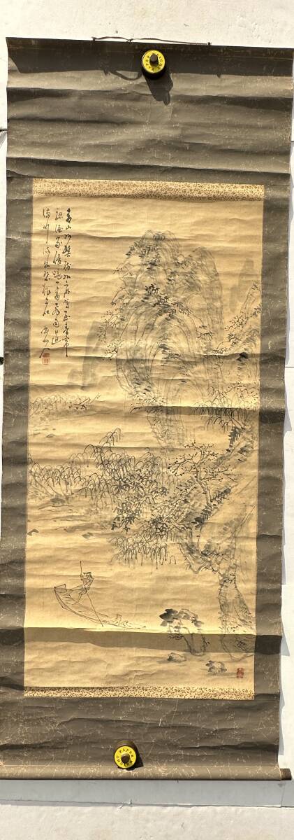 - ★コレクター必見!! 当時物 現状品 ビンテージ 掛軸 山水画 中国? 銘入 作家物 壁飾り インテリア 雑貨 詳細不明 美術 レトロ KZ917