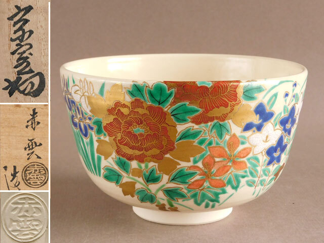 - 岡田 赤雲 四季草花絵 茶碗 裏千家 淡々斎 書付