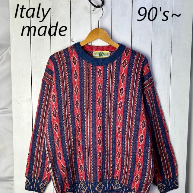 > 美品 90s イタリア製 ネイティブ柄ストライプ ジャガードニットセーター M ウール アクリル オールド ヴィンテージ ミドルゲージ 厚手●299