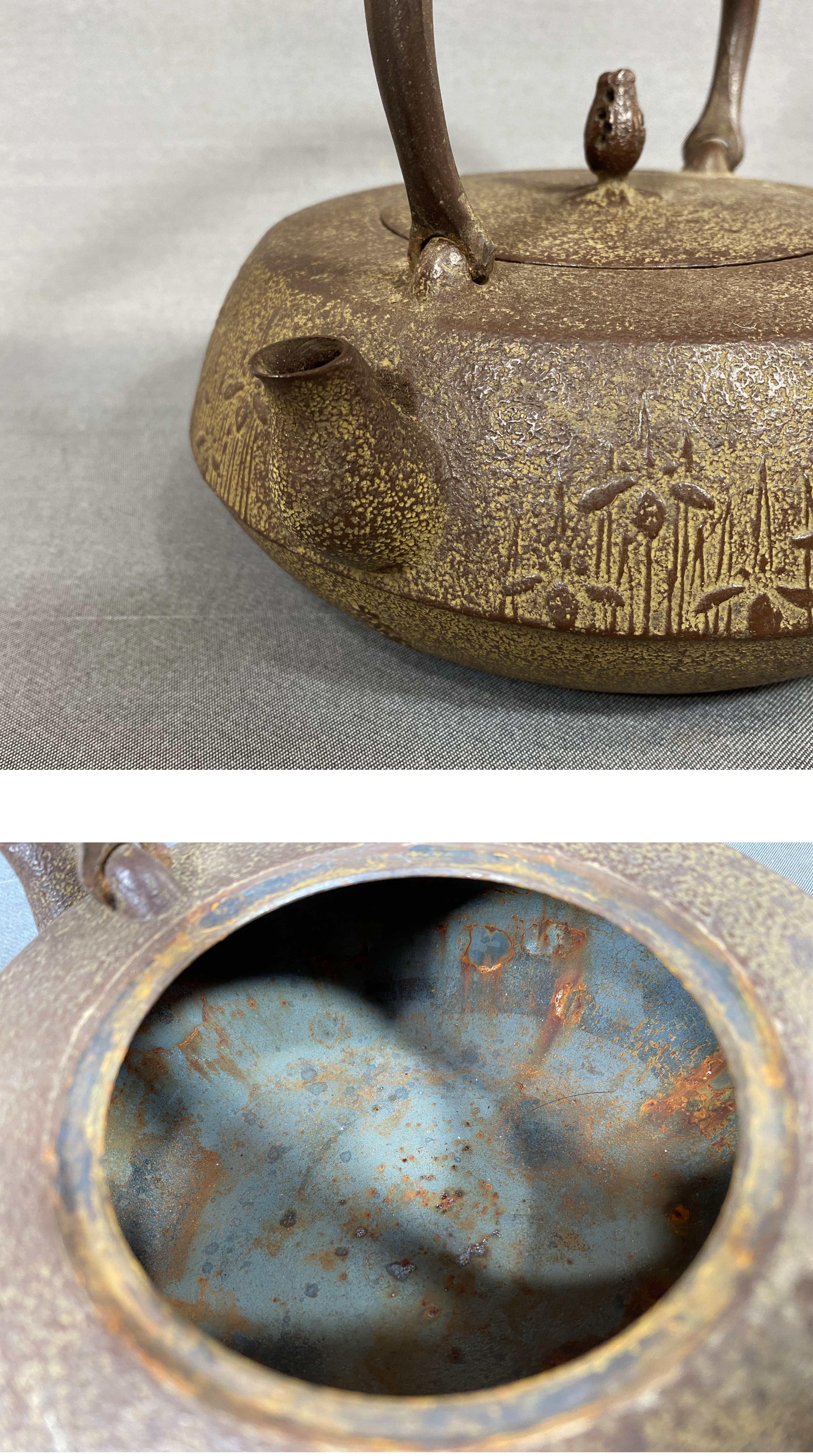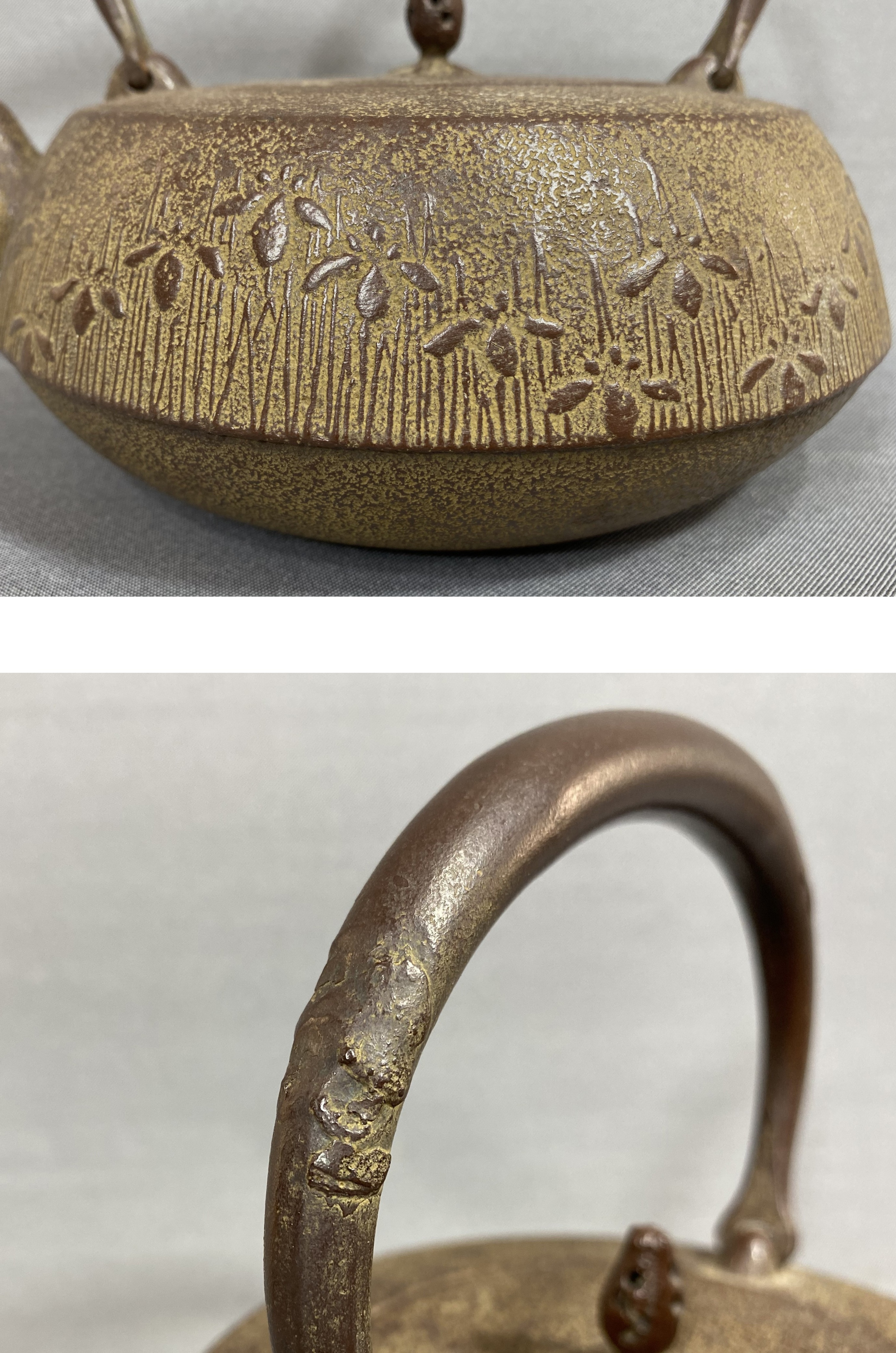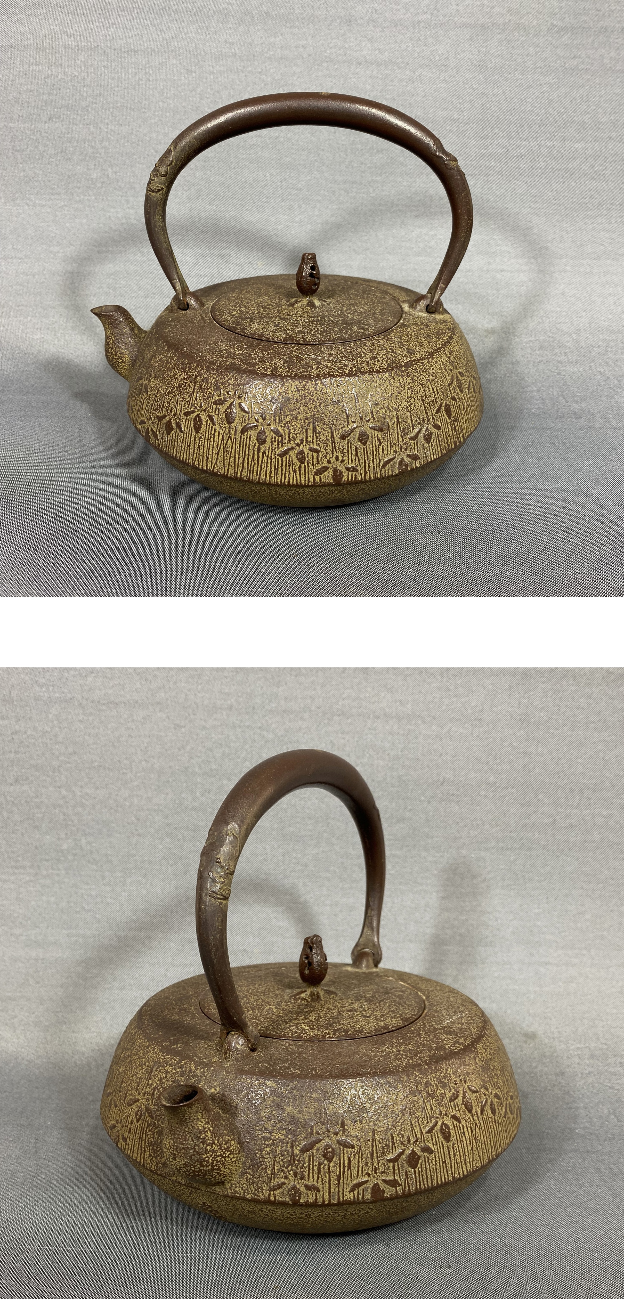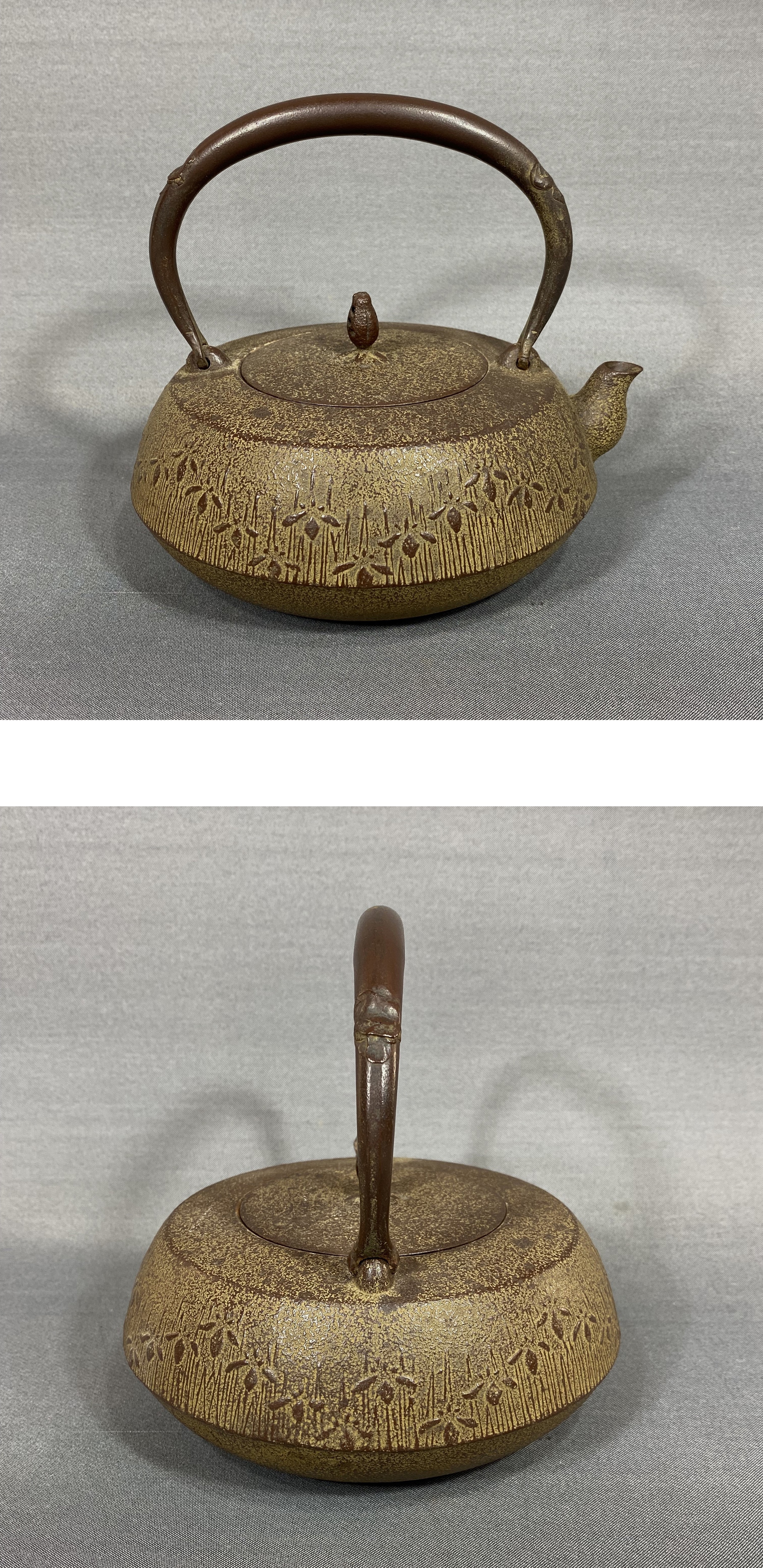 > 【風車】釜師 鈴木忠兵衛 造 草花文 鉄瓶 主善堂▲水漏れ無 重1.3㎏ 在銘▲南部鉄器 盛岡名工 かわいい 希少模様