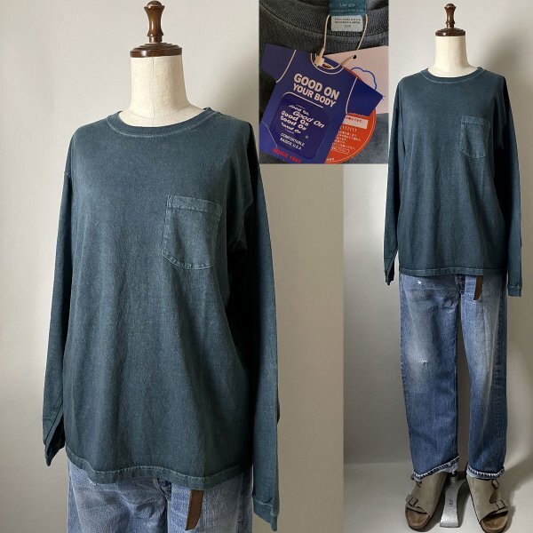 - ★【新品 タグ付き希少 定番 USA製ファブリック 日本製】 GOOD ON グッドオン 22sfl 製品染め 無地 ポケット 長袖 Tシャツ L グリーン