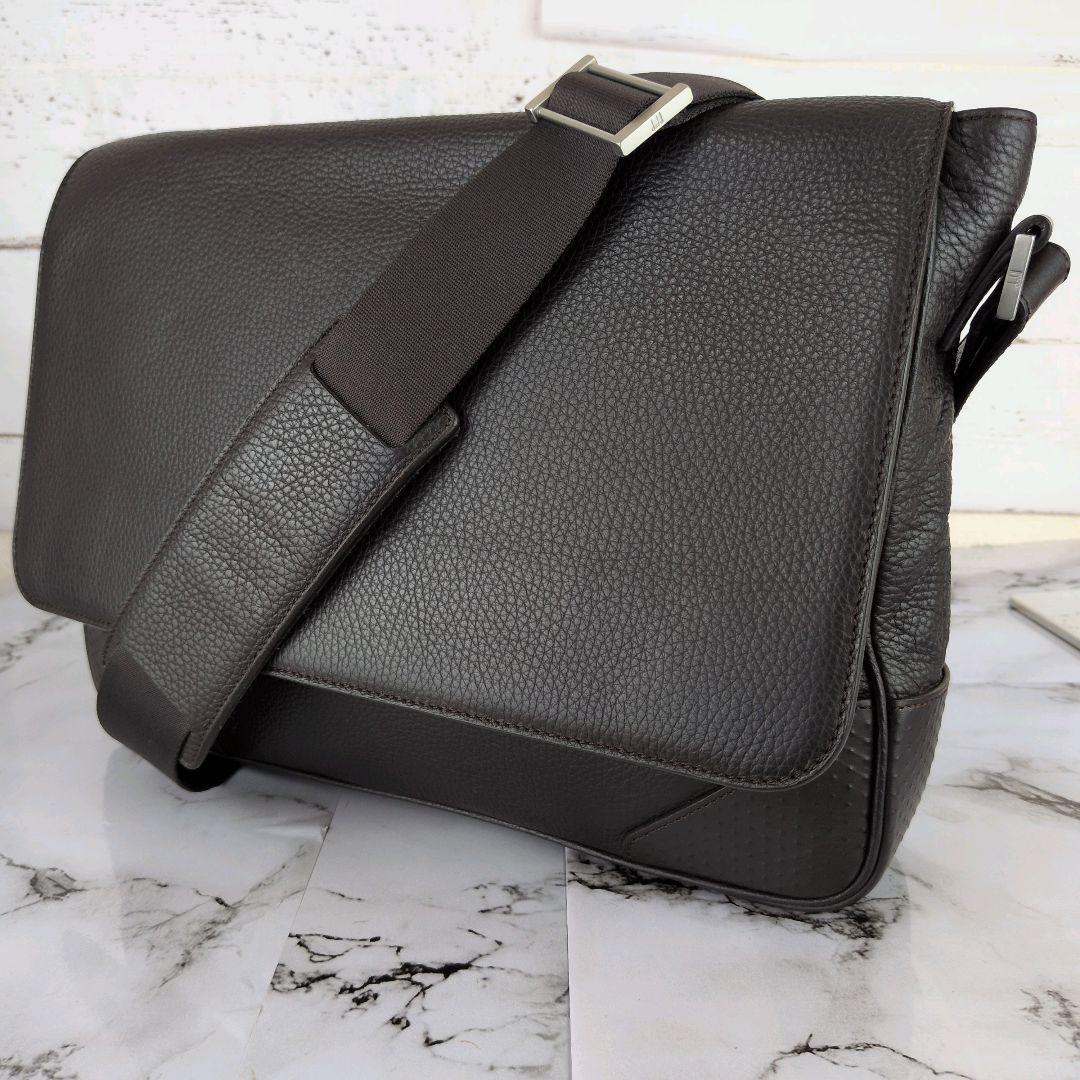 > 【極美品】ダンヒル dunhill A4収納可 オールレザー シボ革 メッセンジャーバッグ ロゴ刻印 メンズ ダークブラウン 肩掛け 斜め掛け メンズ