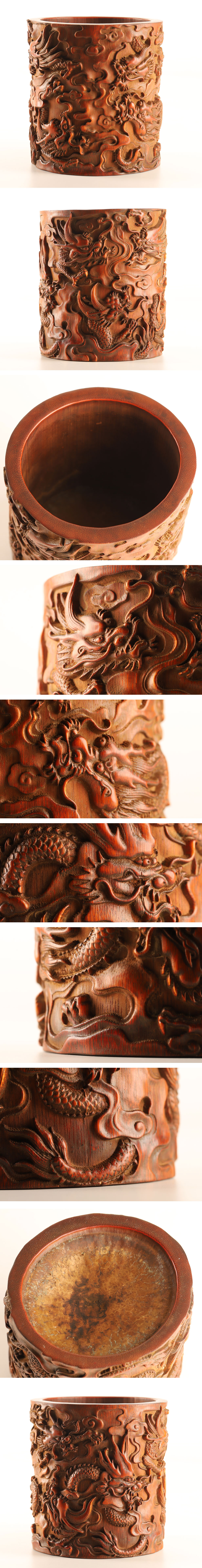 【流】中国美術 竹造 龍彫筆筒 PB242