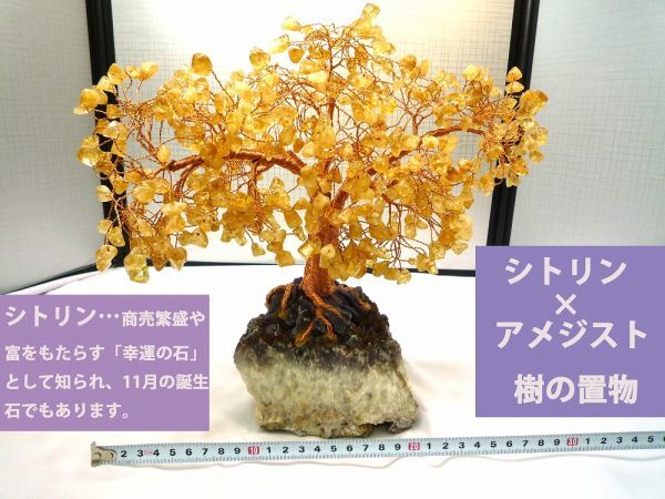 > 20328【中古品】 宝石ツリー シトリン×アメジスト 銅線 招財樹 天然石 11月誕生石 クリスタルツリー 接着剤の部分にやや変色?有り