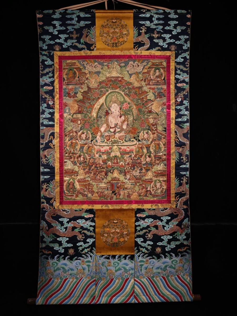 - 永し 明時代 寺廟藏傳 密教 明代高僧絵 鉱物彩 皮革【白度母 佛図】肉筆保証 掛け軸 極細工 古美術品 時代物 古董品 旧家蔵出 中国唐物