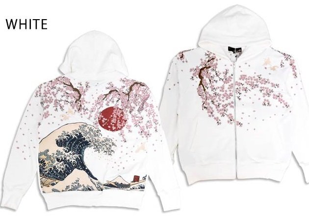 > 粋 北斎神奈川沖浪裏スウェットジップパーカー◆絡繰魂 ホワイト Lサイズ 254018 和柄 和風 刺繍 浮世絵 からくり