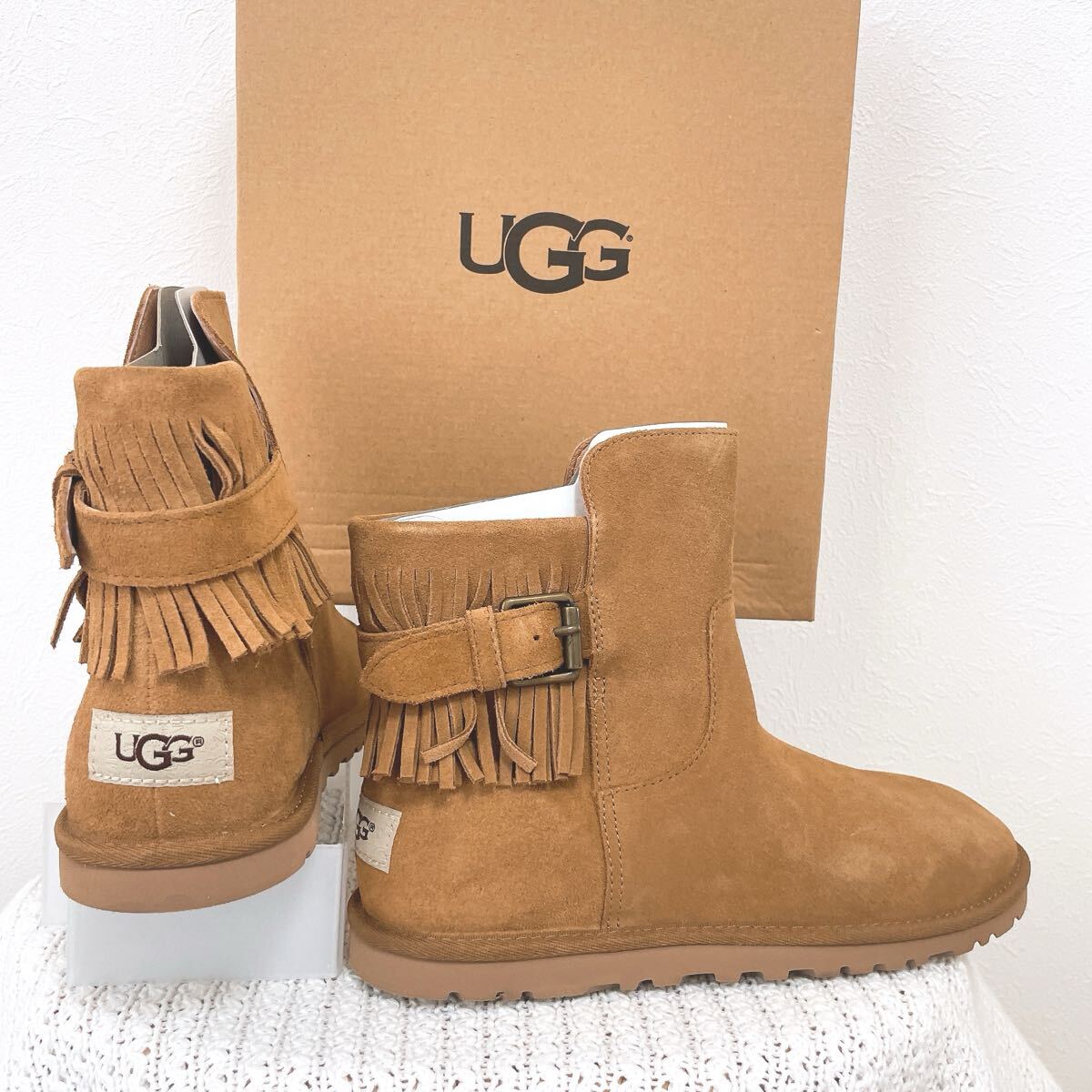 > ★新品★アグUGGスエード フリンジ シューズW CARAショートブーツ キャメルMINIブラウンUSA7 UK5.5 EU38 JAPAN24 M-Lサイズ カジュアル