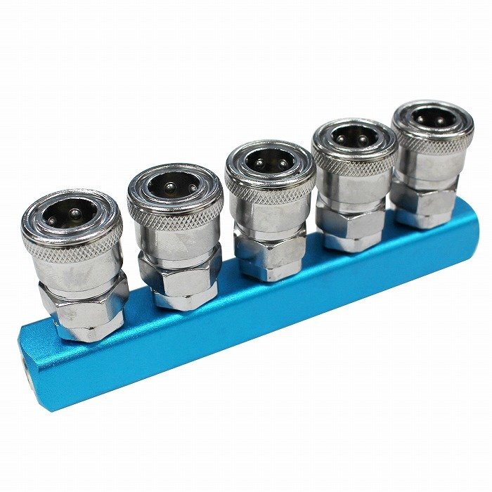> 1/4 ワンタッチ式 5連 マルチ エアー カプラー 青/ブルー エア ホース ツール コンプレッサー 分岐 プラグ カプラー ホース