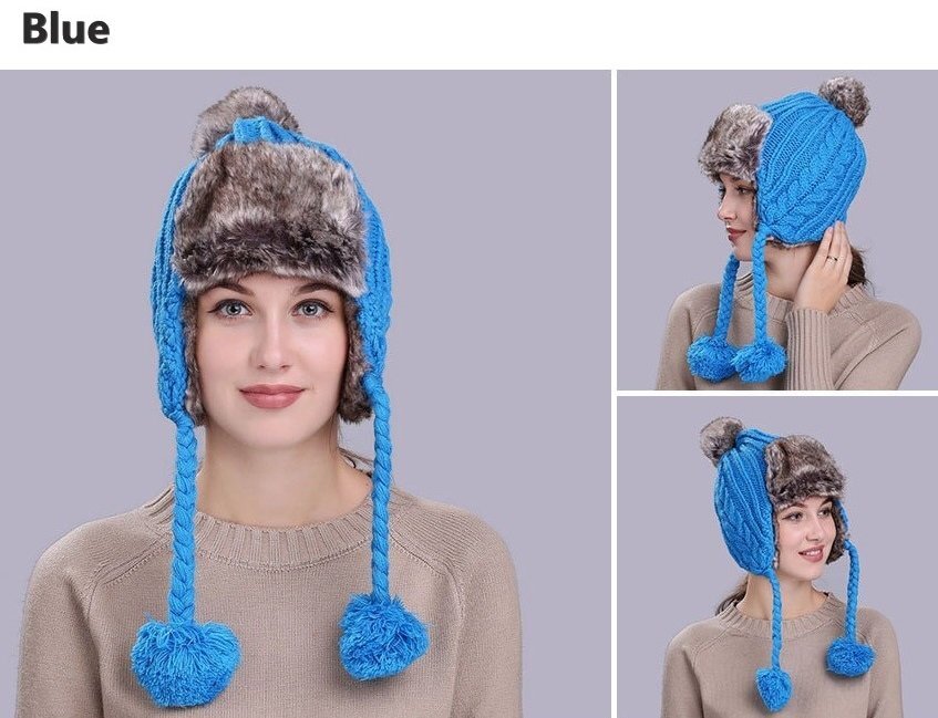 - ニット帽 ブルー レディース 秋冬 厚手 帽子 ニット 柔らか キャップ hat アウトドア ポンポン付き あったかい オシャレ 冬 耳当て n836