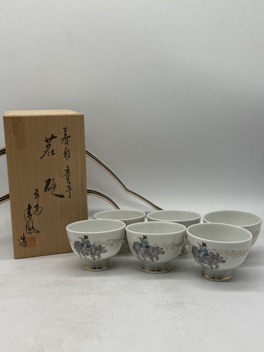 - No.133 平安清鳳 着彩 茶碗 六客揃 牛乗り童子図 金彩 共箱付 茶器 煎茶道具 湯呑 茶道具 煎茶器 和食器 湯呑み 煎茶碗 陶器 九谷焼