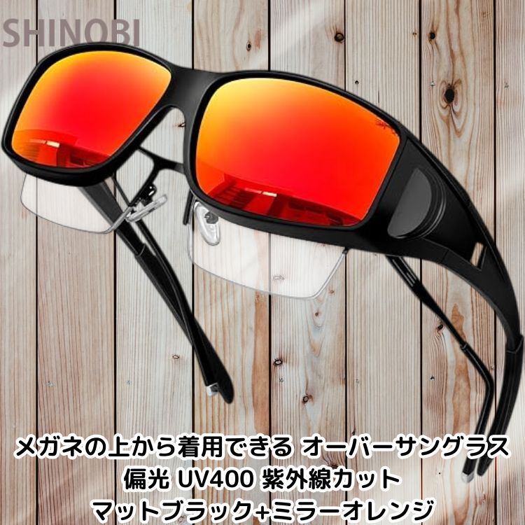 - メガネの上から着用できる オーバーサングラス 偏光 UV400 紫外線カット マットブラック+ミラーオレンジ