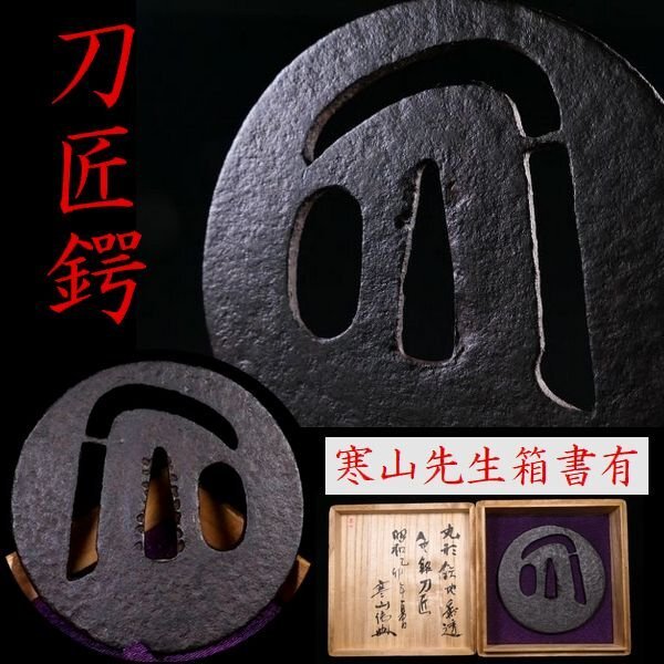 > 【 恵 #1927 】 ◆寒山先生箱書有◆ 刀匠鍔 「鎌透かし図」 鉄地大鍔 長径 8.6cm以上 検:鍔/縁頭/切羽/ハバキ/刀剣/刀装具
