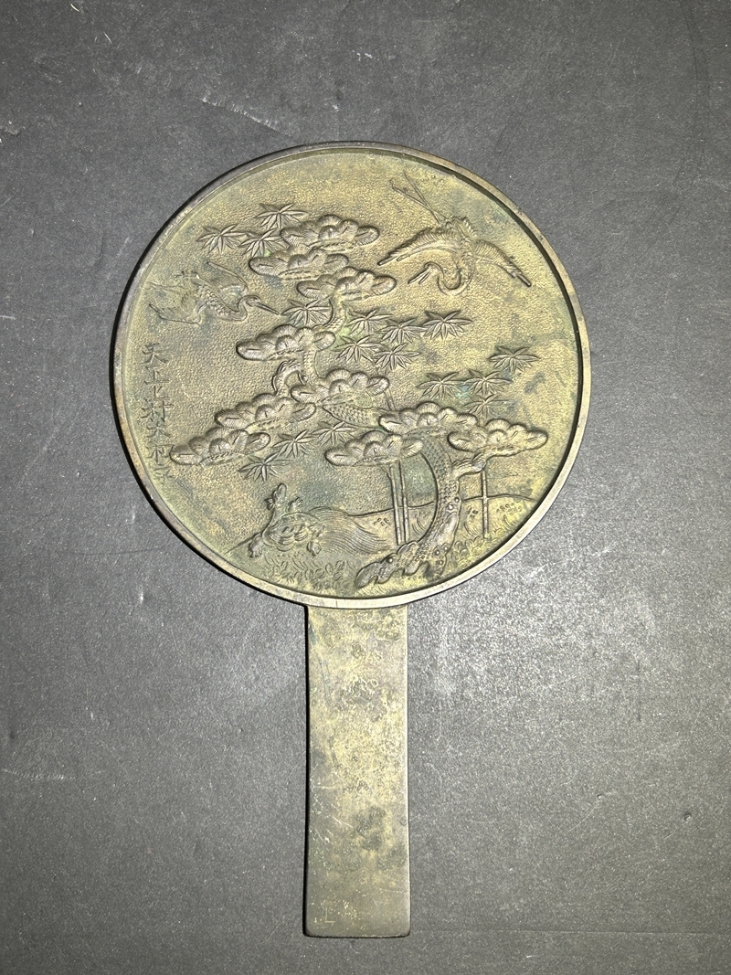 - ● コレクター必見 古鏡 天下一上村大和守 銅鏡 和鏡 鶴亀松 重さ約346g 古い 鏡 コレクション Zr752