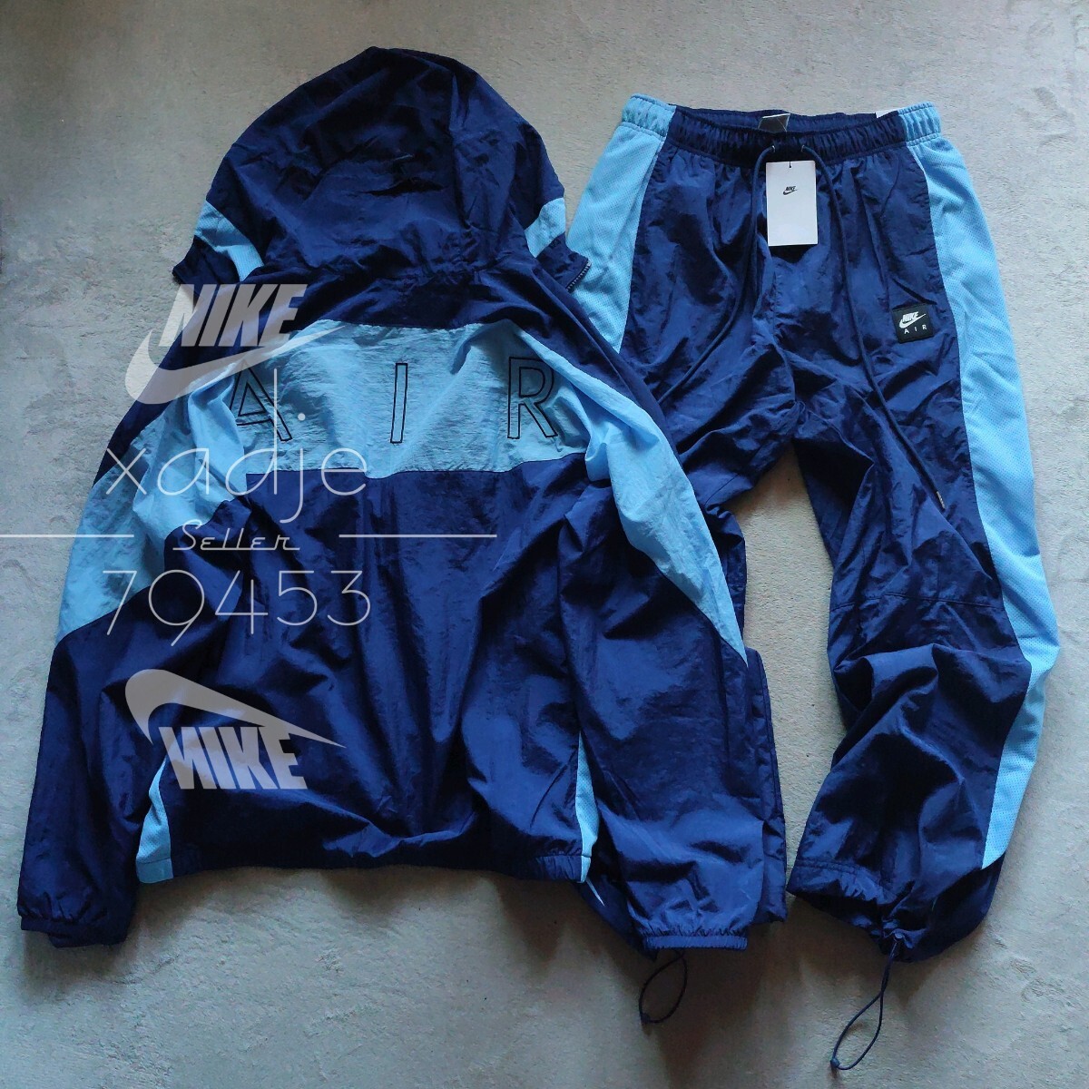 > 新品 正規品 NIKE AIR ナイキ 上下セット ナイロン パーカー パンツ セットアップ 紺 ネイビー 水色 裏地メッシュ 定価26070円 XL