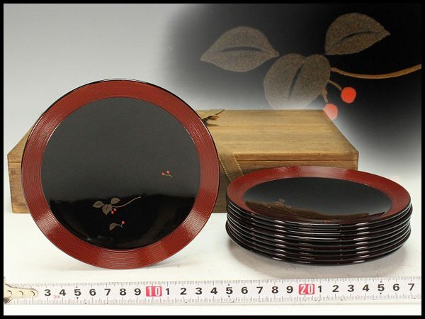 - 【金閣】南天蒔絵 漆器 糸目皿 十客 美品 共箱 旧家蔵出 送料無料(RC957)