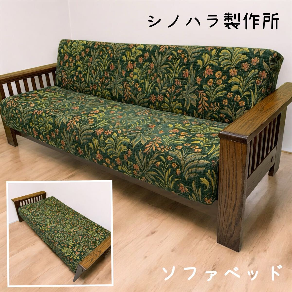 - H■直接引取可■ シノハラ製作所 木楽 3人掛け ソファベッド 木製 花柄 総柄 グリーン 緑系 3Pソファ 2way 家具 カントリー調 インテリア
