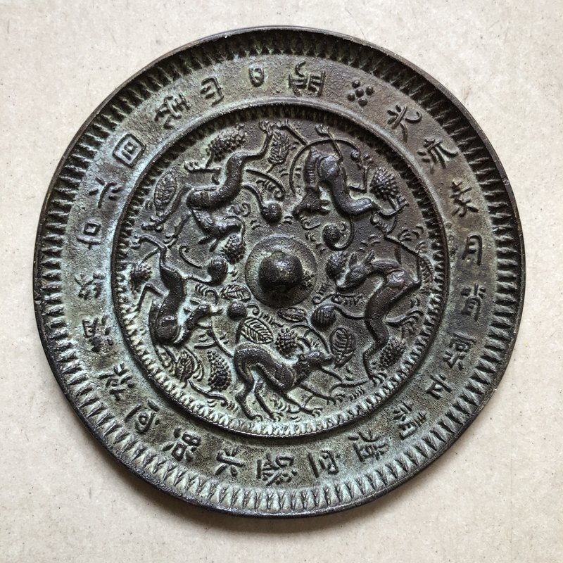 - 極美品 !高品質!中国 銅器 純銅鏡 唐銅鏡 黒漆古円形銘文 五獣模青銅鏡 青銅彫 銅製 置物 擺件 収蔵 鑑賞 中国美術品