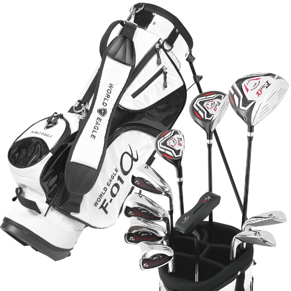 - F-01α クロスモデル メンズゴルフクラブセット スタンド式軽量キャディバッグ付 右利き用 バッグ:ホワイトカラー/フレックスR[33929]