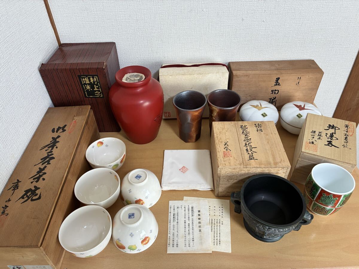 - S25112001 陶器 工芸品 有田焼 6種おまとめ 乃りたけ 若宮 蓋物揃 鶴文 備前焼 村上木彫堆朱 伝統工芸品 花瓶 深川製磁 赤絵丸紋 和食器