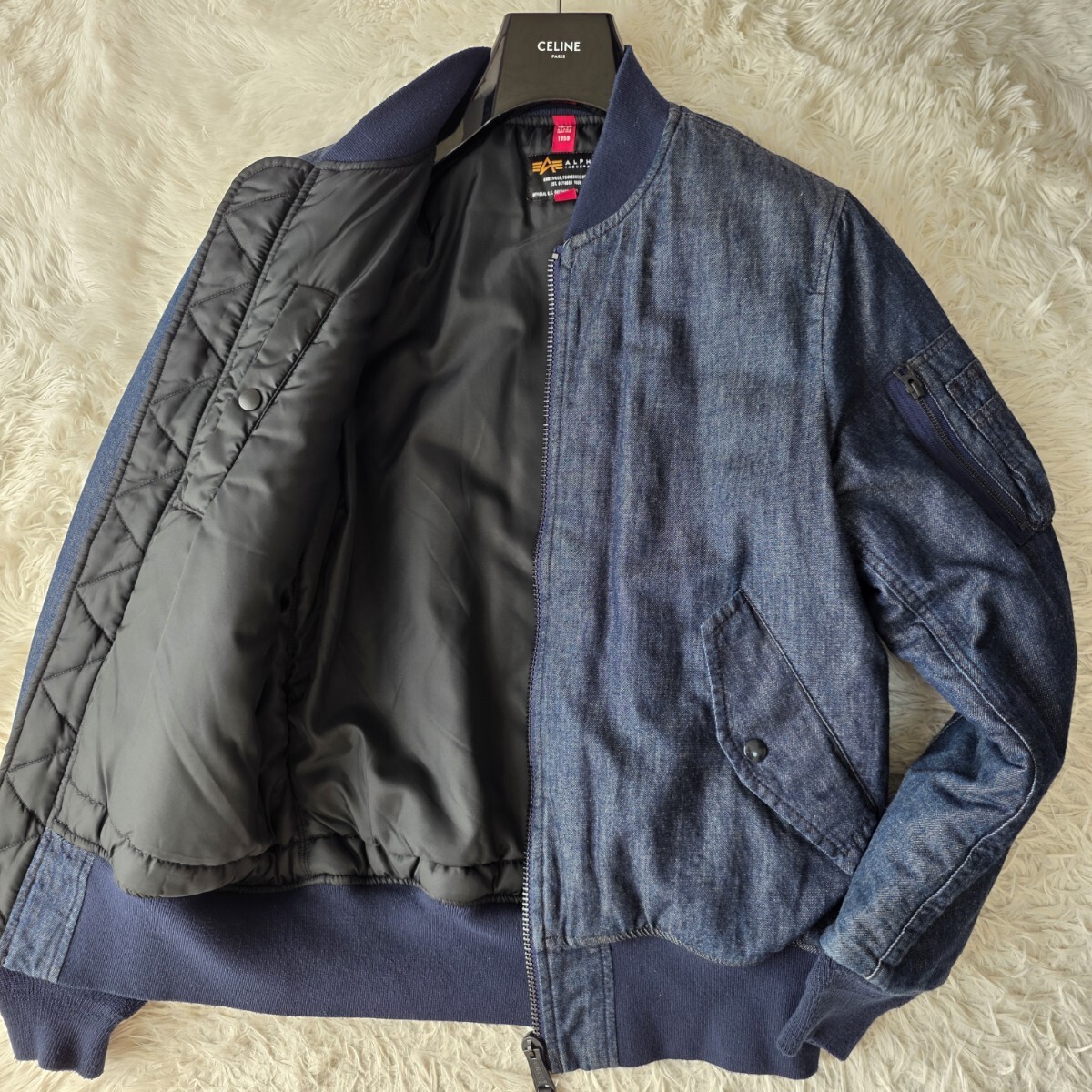 > 良品 Lサイズ ●ALPHA アルファ MA-1 フライトジャケット WASHI DENIM 中綿 デニム KAIHARA DENIM ネイビー BACK NUMBER メンズ ブルゾン