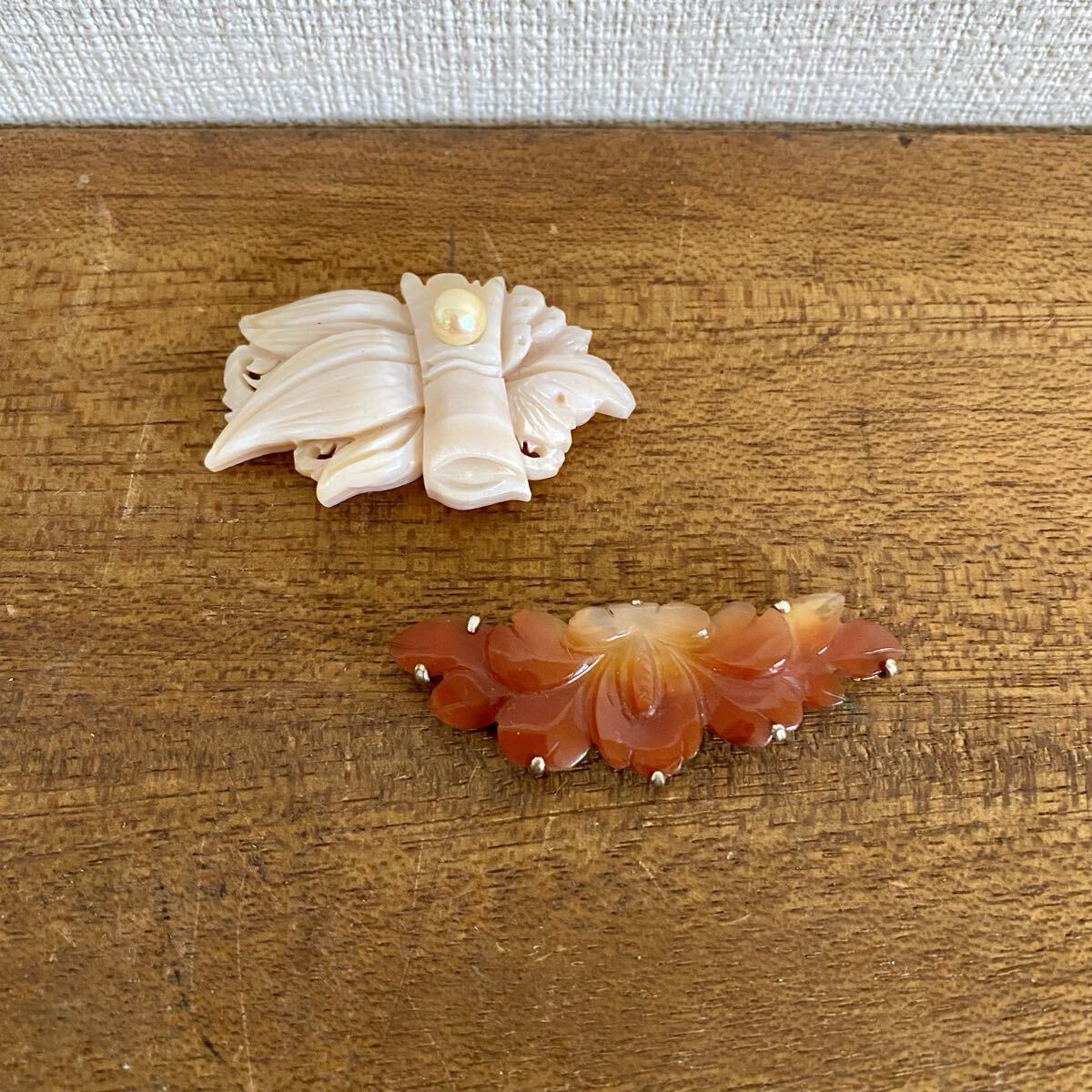 - 和装小物 メノウ 瑪瑙 白蝶貝 パール 帯留め 2点セット / 彫刻 シェル 真珠 貝細工 花彫刻