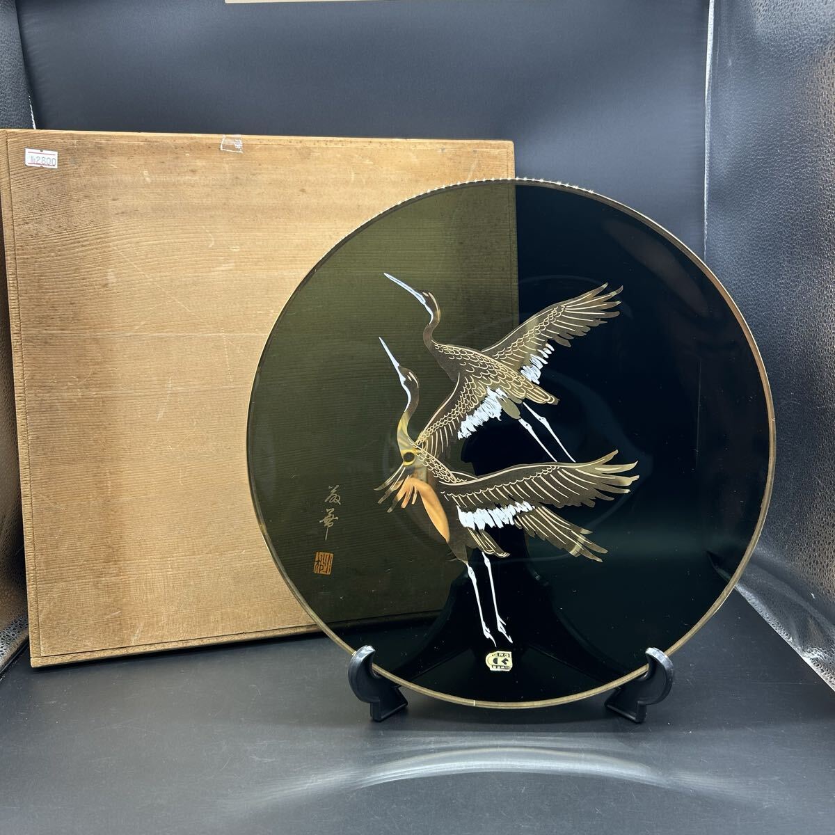 - 鶴文 大皿 工芸品 ガラス G.R.G 萬華? 金彩 飾皿 フ17