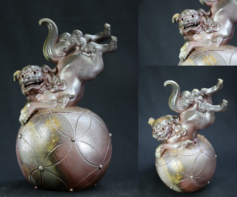 - 備前名品【玉獅子香炉】西村春湖作 跳ね獅子精悍精緻超希少