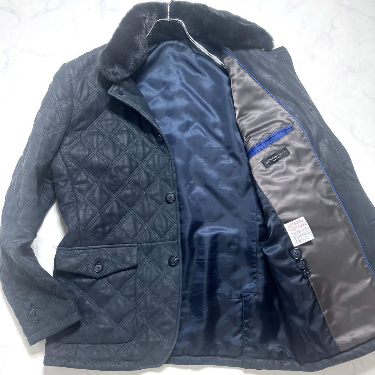 > 美品/XLサイズ NICHIWA レザージャケット キルティング●ラムレザー 羊革 本革 中綿 襟ファー着脱 ブルゾン ブルーグレー メンズ ニチワ社