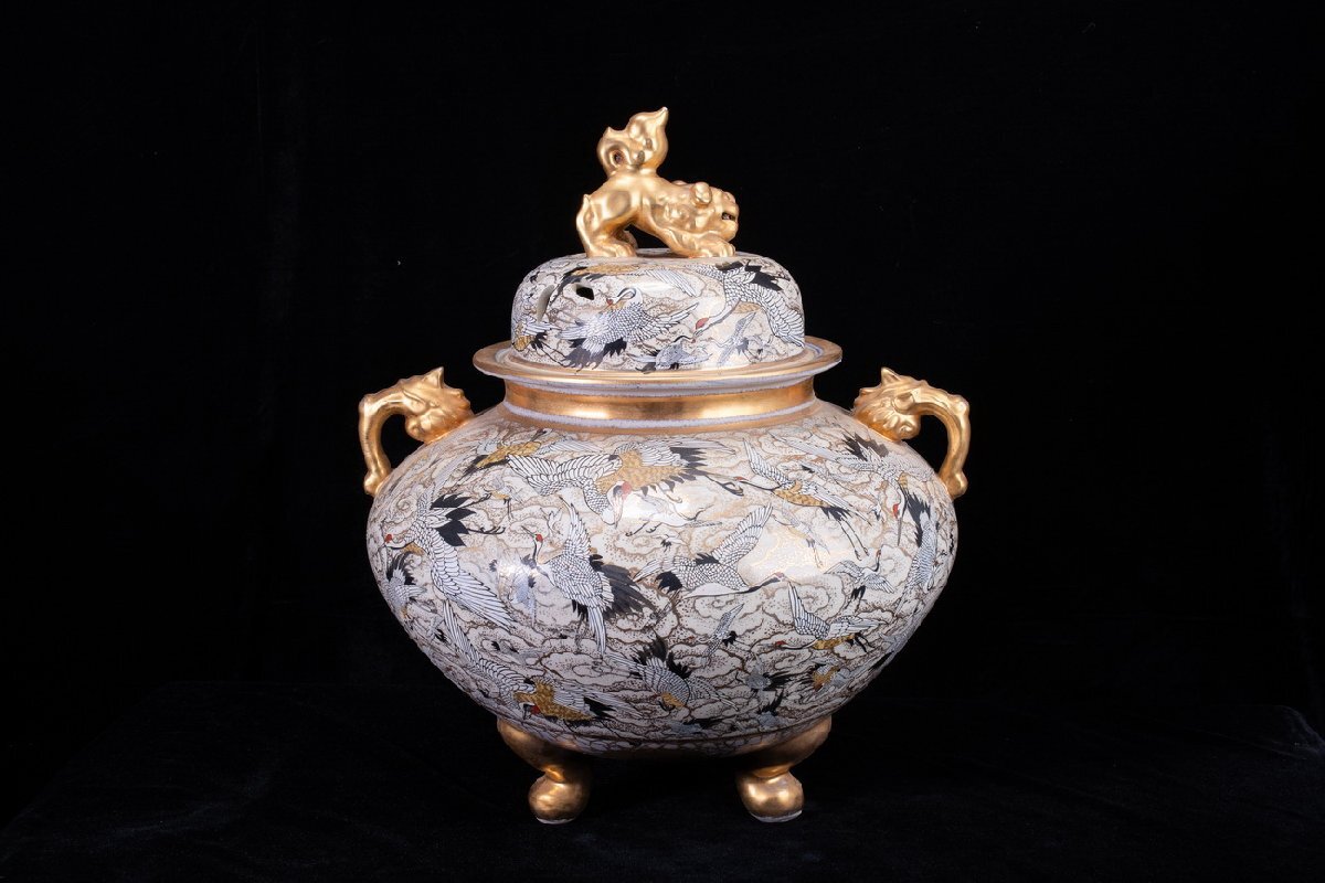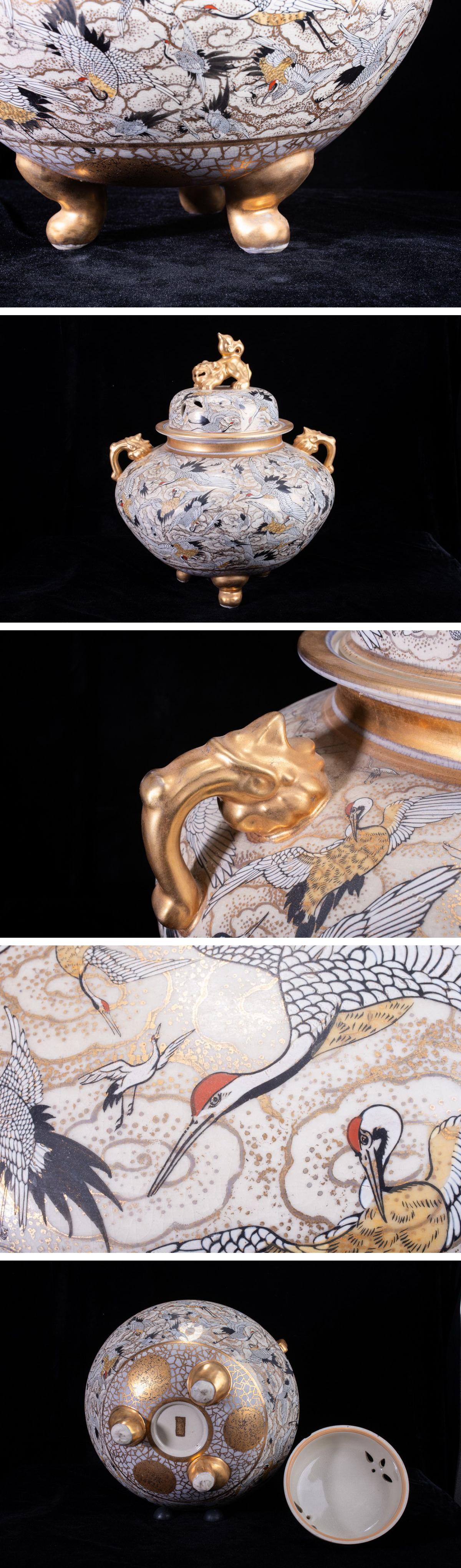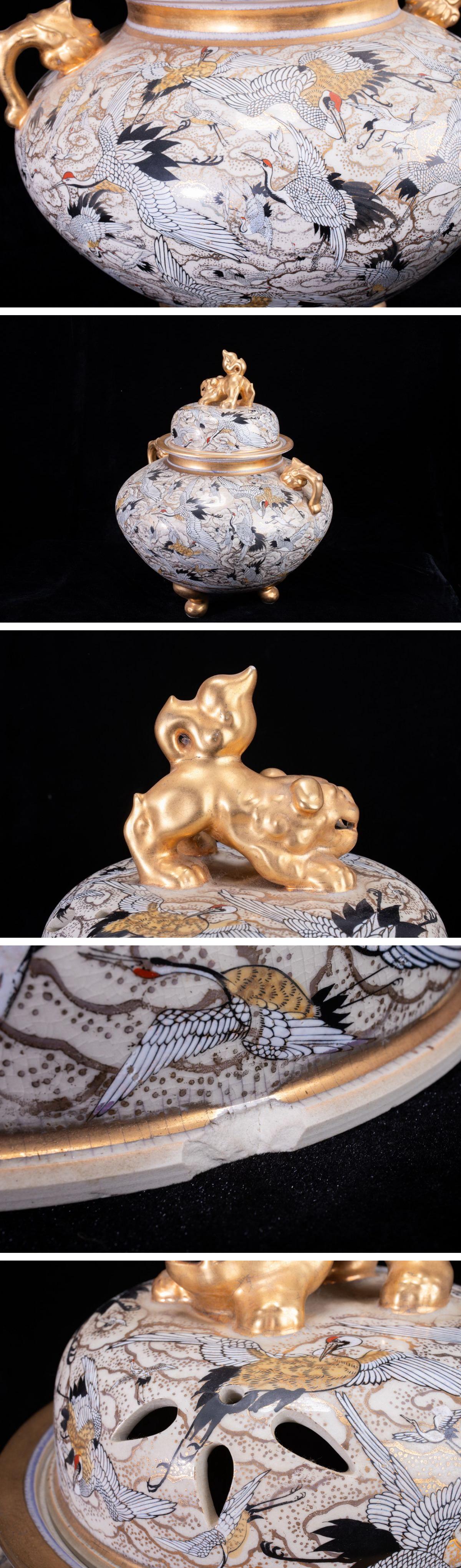 - 【珍品堂】1円から N35-V32 薩摩焼 金襴手 鶴図 金彩 三足 大香炉 高54㎝ 香炉 獅蓋 両耳付 香道具 鑑賞品 時代物 工芸品 骨董品 古美術
