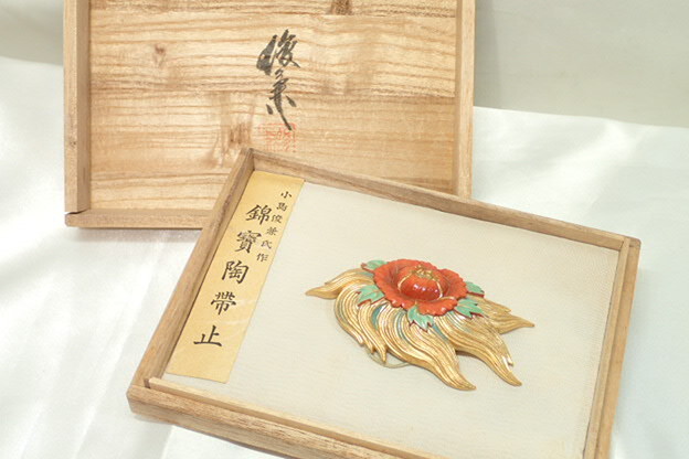 - 11231[M]木箱付◆在銘 俊兼◆小島俊兼氏作/錦寶陶帶止/花/帯留め/陶芸/着物/和装小物/レトロ♪