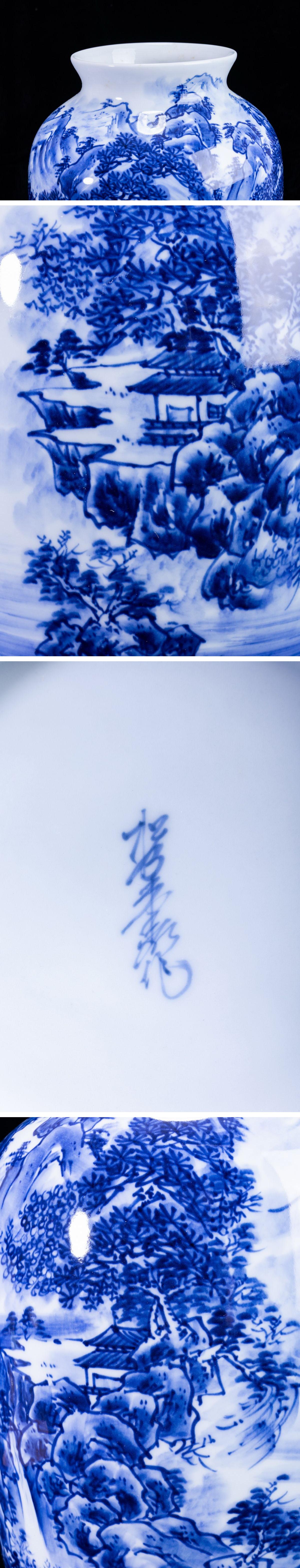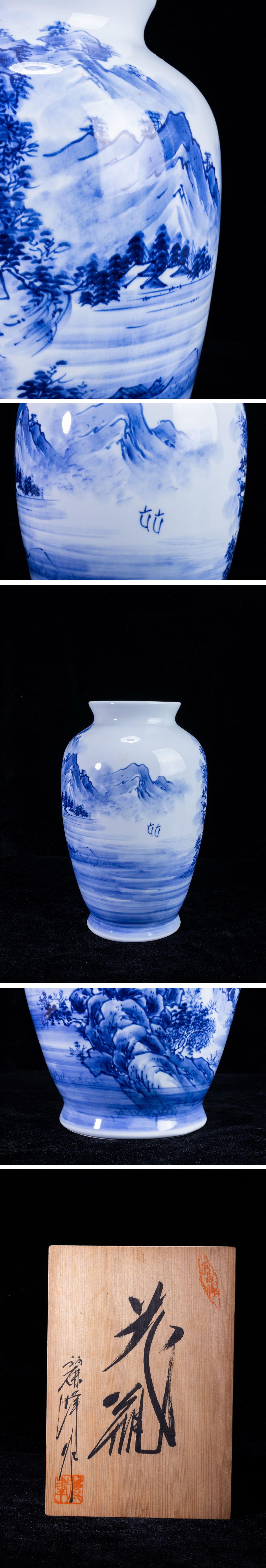 - 【珍品堂】1円から R62-V1有田焼 松右衛門 在銘 山水図 染付 繊細絵付 花瓶 高36.5㎝ 花器 壺 共箱 木箱 工芸品 時代物 骨董品 古美術