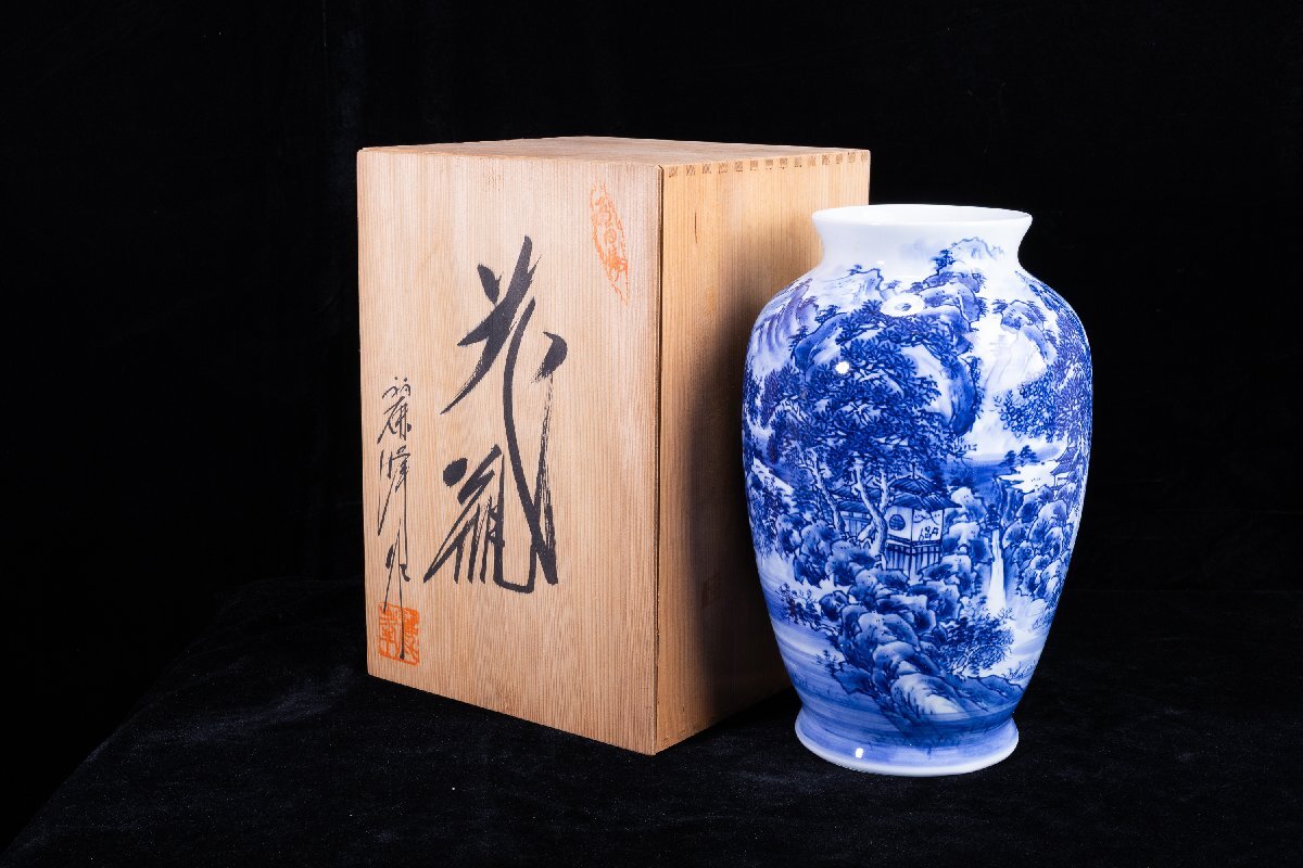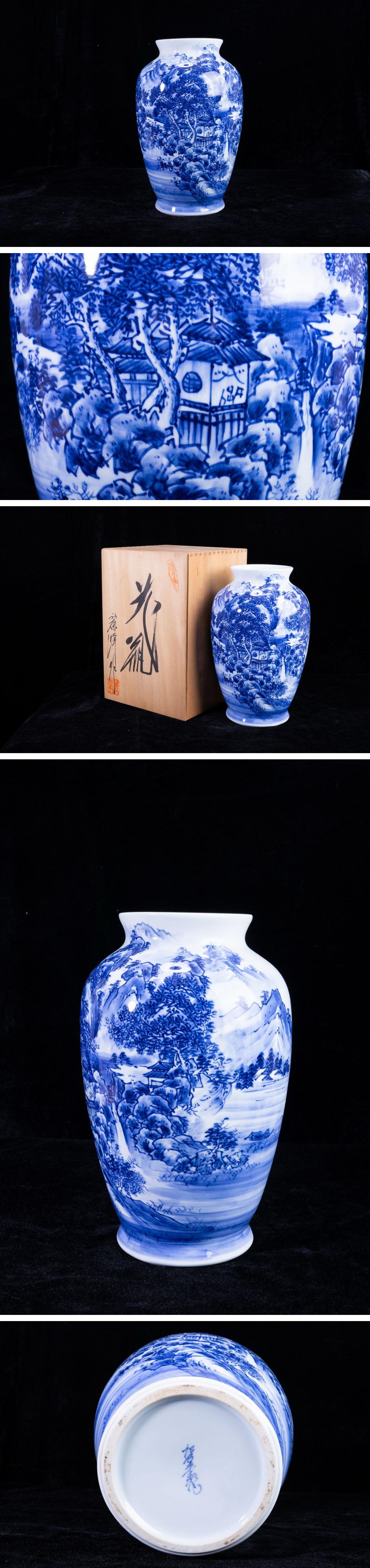 > 【珍品堂】1円から R62-V1有田焼 松右衛門 在銘 山水図 染付 繊細絵付 花瓶 高36.5㎝ 花器 壺 共箱 木箱 工芸品 時代物 骨董品 古美術