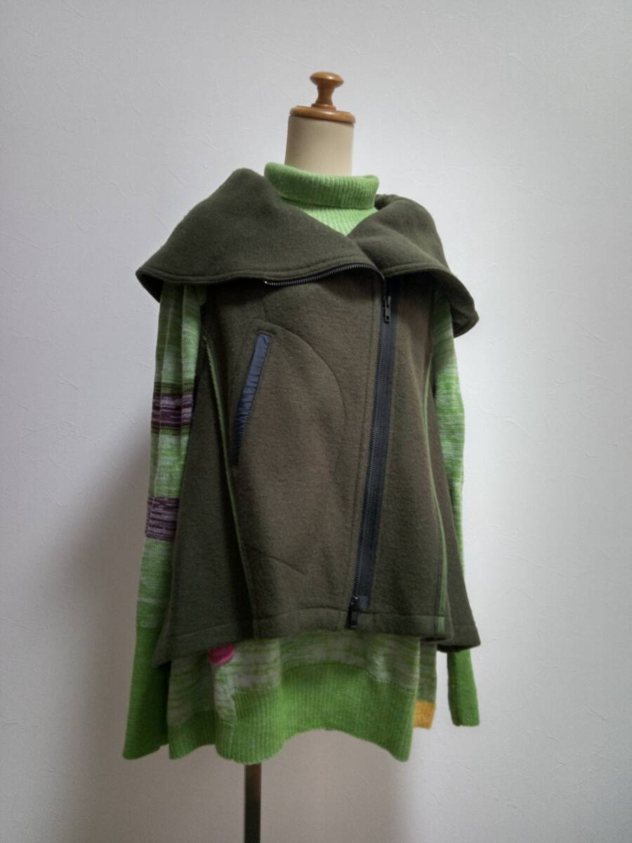 - センソユニコ「cube cube」キューブキューブ 38サイズ 襟付カーキ色ウール ネイビー キルト綿入 ドッキング ジッパーベスト