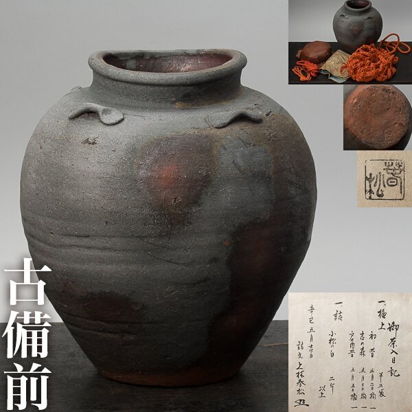 > 【千h1255】古備前 四耳壺 茶壺 桃山時代 高さ約26cm 桐箱 葉茶壺 備前 壺 壷