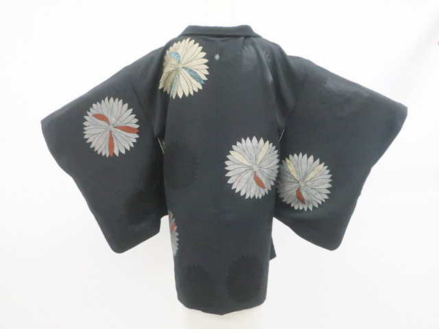 - 《古美術京松》黒羽織 アンティーク 縫紋 羽織紐付 正絹 着物 身丈約82cm 裄丈約63cm kyo7z10-1189