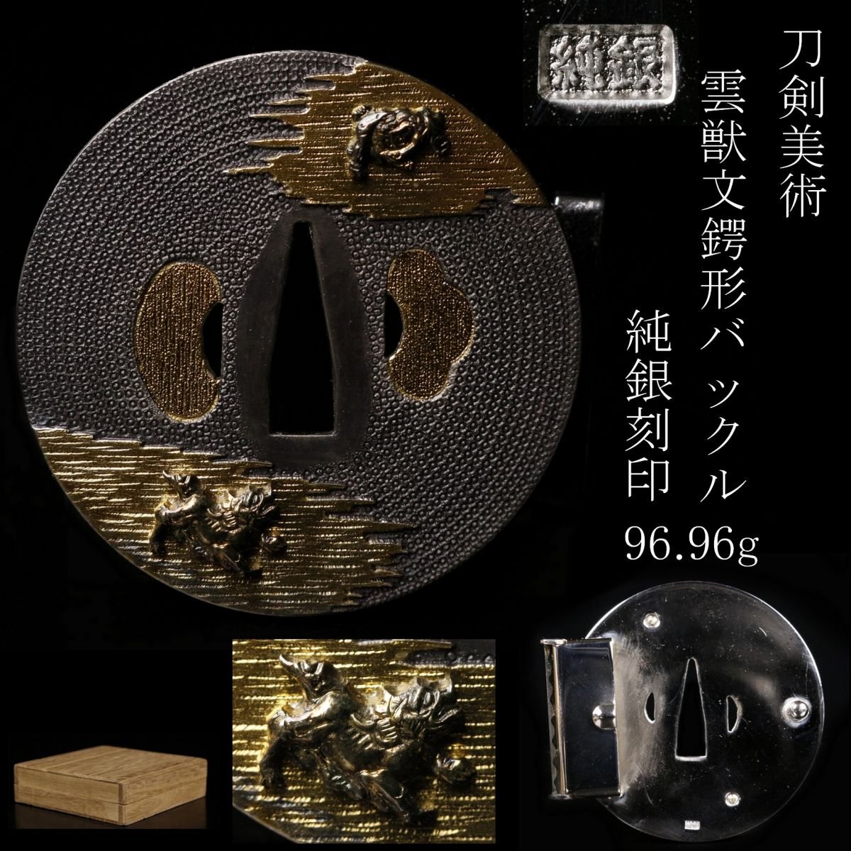 - 【LIG】刀剣美術 雲獣文鍔形バックル 純銀刻印 96.96g 箱付 刀装具 時代武具 コレクター収蔵品 [.WR]25.8